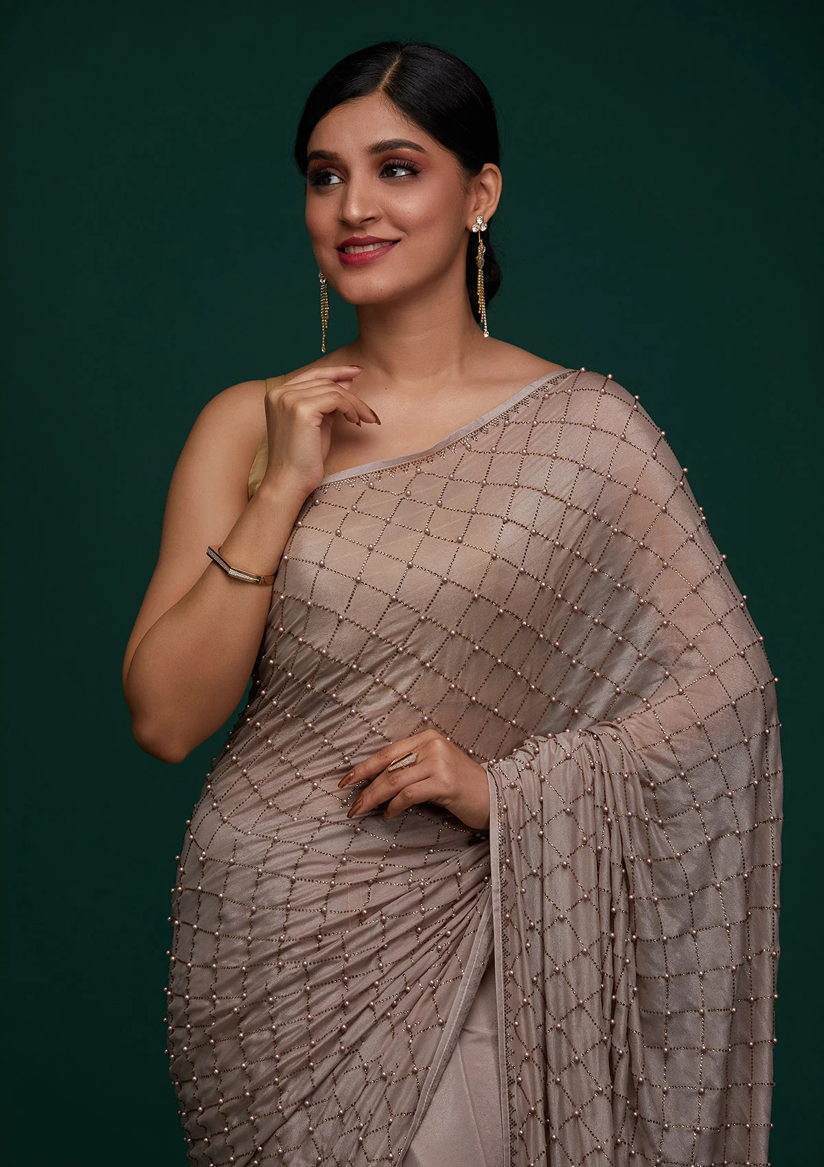 Product Details Step into the spotlight with Koskii's exquisite beige satin saree, …