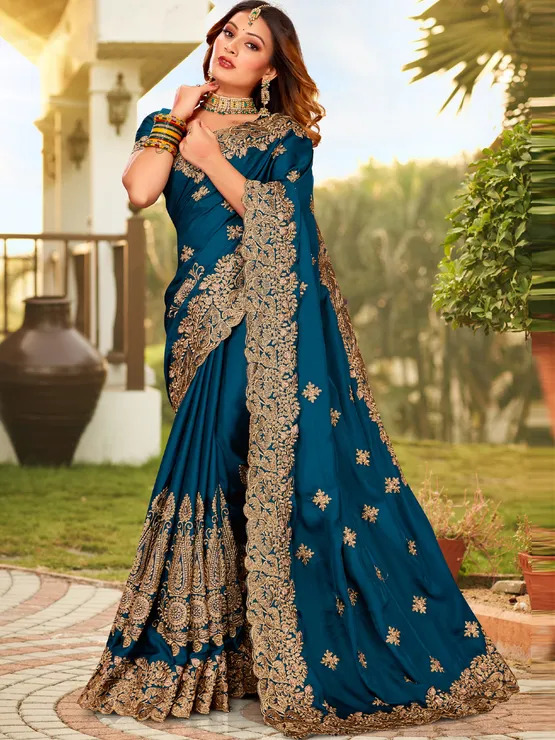 Description: Blue color Saree in Satin Silk, Silk fabric with Embroidered, Thread, …